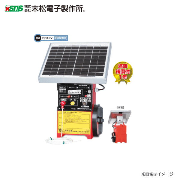 【特 徴】 1.電池交換不要の太陽電池式 2.プラスチック製の完全防雨型設計 3.出力電圧が確認出来るレベルメーター付 4.バッテリーの状態がひと目でわかる電池試験スイッチ 5.2段階出力ランプ(色で電圧が落ちたらお知らせ) 6.電池の交換が簡単なネジフタ方式を採用! 7.単1アルカリ電池8本で約3ヶ月の動作可能(夜間のみ使用時) 8.従来よりさらに衝撃電流の出力アップ 9.連続、夜のみ、昼のみ、切の4段階切り替えスイッチ 10.見やすいデカ文字操作パネル □ ゲッターエース3ソーラー ACE12−3S :電源 DC12V(ゲッターアルカリ電池12V内蔵) :最大出力電圧 10,000V :最大電線長 約3,300m 2段の場合・・・1650m 3段の場合・・・1100m 4段の場合・・・ 825m :機能 過充電防止 ○ バッテリー保護 過放電防止 ○ バッテリー保護 切替スイッチ 4段階 切 動作停止 連続 1日中動作 夜 自動的に昼のみ出力を発生し夜は停止 昼 自動的に夜のみ出力を発生し昼は停止 光センサー ○ 切替スイッチ夜間時に周囲の明るさを検知 電池残量 ○ 電池試験スイッチ付 出力確認 ○ 出力発生時にLEDランプ点滅(良好/点検 2段階式) レベルメーター ○ 4段階のLED表示で電圧の強さを表示 単1電池 × 12Vバッテリー ○ バッテリーコードにて接続可能 :寸 法 :高さ355mm×幅233mm×奥行200mm :重 量 :約5.2kg(電池・付属品含む) :付属品 :ゲッターアルカリ電池12V(単1アルカリ電池8個内蔵)1個 :出力コード2.5m1本:アース棒30型1セット:バッテリーコード1個 :注意表示板2枚:取扱説明書1冊:保証書 :保証期間 3年電柵器本体 電柵器セット商品一覧 ●イノシシ用 ●サル用3段 ・クイック3300 Qik-3300 ・クイック3300ソーラー Qik-3300S ・ゲッターエース3 (9,500V) ・ハイパワーゲッター[HP-8000] ・ゲッターTakumi [TKM-12K] ・セキュリティゲッター[SEC12-3] ・ゲッターEXソーラー [EXT12-3S] ・セキュリティゲッターソーラー[SEC12-3S] ・ゲッターEX [EXT12-3] ・クイック600[Qik-600] ・クイック600ソーラー[Qik-600S] ・クイック2000 Qik-2000 ・クイック2000ソーラー Qik-2000S ・家庭用100V式 AC-1000 ・250mFQ2ポールセット2段張り ・500mFQ2ポールセット2段張り ・250mFRPセット2段張り ・500mFRPセット2段張り ・サル用のネット式3段 50mセット ・サル用のネット式3段 100mセット ・サル用のネット式3段 150mセット ・サル用のネット式3段 200mセット ●シカ用 ●サル用6段 ・500m FRPセット5段張り ・サル用のネット式6段50mセット ・サル用のネット式6段 100mセット ・サル用のネット式6段 150mセット ・サル用のネット式6段 200mセット ●放牧用 ・500m FRPセット2段張り ●小動物用 ●クマ用 ・ネット式小動物用100mセット ・小型電気柵デンエモン100mセット ・クマ用100m FRPセット2重張り ※上記商品以外(部材商品/セット商品等)もご用意しております。