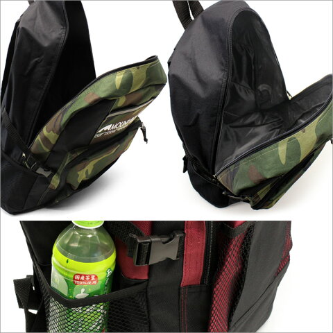・商品スペック サイズ (約)H52×W36×D20cm 重量 (約)570g 素材 ポリエステル 仕様 ・前面オープンポケット×1 ・前面ファスナーポケット×1 ・前面メッシュポケット×1 ・サイドメッシュポケット×2 ・チェストベルトあり カラー ブラック、グレー、ワイン、ブルー、カーキ、カモフラ、ネイビー ・ご注意事項 ※お使いのモニターやデバイスの調整により、画面上の色と若干の違いが感じられる場合がございます。